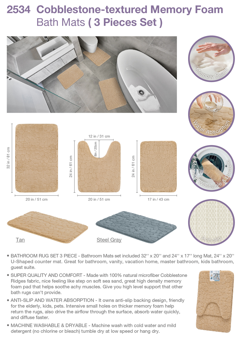 2534 Cobblestone-textured Memory Foam Bath Mats (3 Pieces Set)